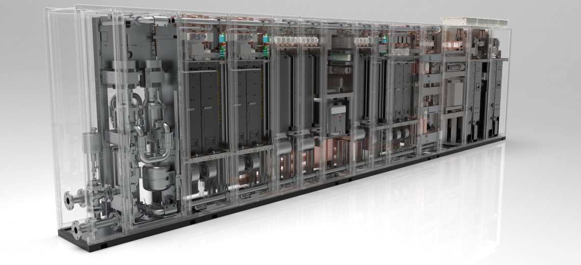 • Completely water-cooled components including filters, capacitors and built-in water to air heat exchangers resulting in totally enclosed water-cooled panel design.